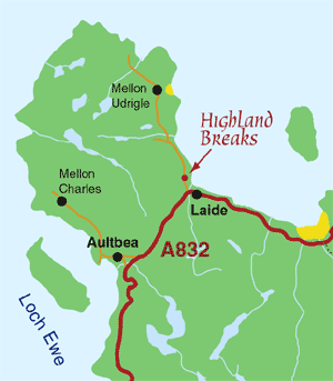 Turn left onto the A832 at Braemore junction. This is signposted for Gairloch. Follow the A832 through Dundonnell and turn right at the Laide junction towards Mellon Udrigle. Your accommodation is about a mile along this road on the left.